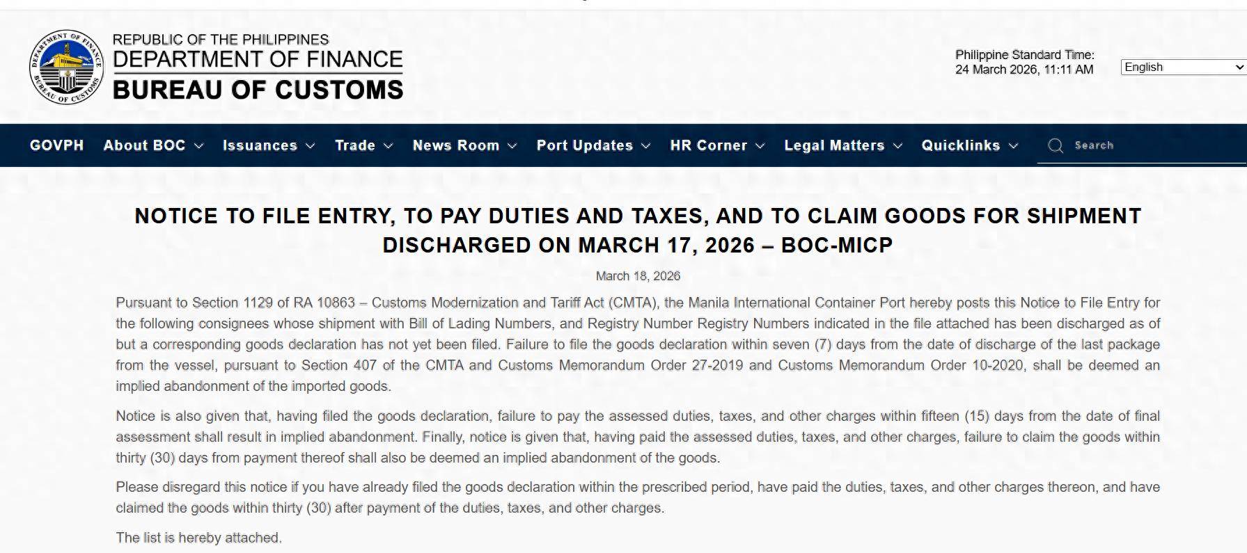 菲律宾海关(BOC)挂出一份通知,截至2026年3月17日,相关收货人、货主或进口人如果未在最后卸货...