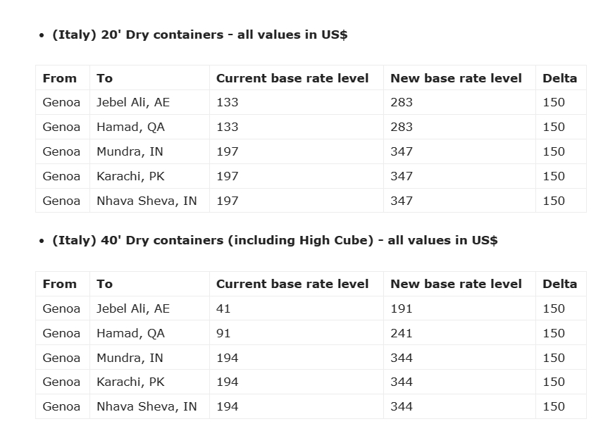 从热那亚到杰贝尔阿里、哈马德、芒德拉、卡拉奇和纳瓦舍瓦的新费率分别增加了150美元。